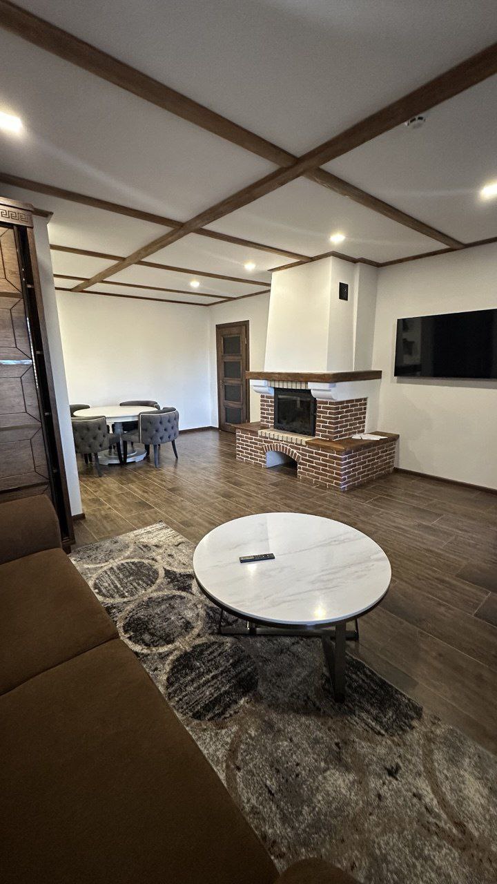 - простору вітальню з каміном з м’якою зоною відпочинку, яка при потребі слугує додатковим ліжком для діток, а також обідню зону;